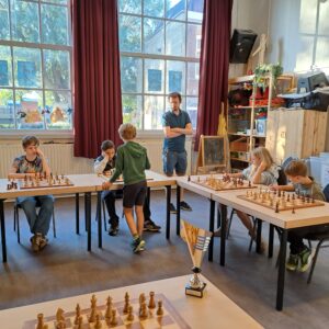 Onverstoorbaar werd doorgespeeld, ook al kwamen inmiddels de senioren een deel van de ruimte innemen met hun klassieke partijen. Douwe wist niet van wijken. Maar ook zijn tegenspelers weken niet! Dat pakte bijvoorbeeld voor Evi goed uit. In een enkele partij had Douwe eerder op kunnen geven en in een aantal andere partijen hadden tegenstanders eerder op kunnen geven. Maar er werd verbeten doorgespeeld. Het resultaat was er naar. Van de 17 tegenstanders wisten Duncan, Evi en Morris te winnen. De partij tegen Evi was een van de laatste die nog bezig was. Jacob, Saaibhaskar en Uri hielden Douwe op remise. Al met behaalde Douwe een prima resultaat van 74%.