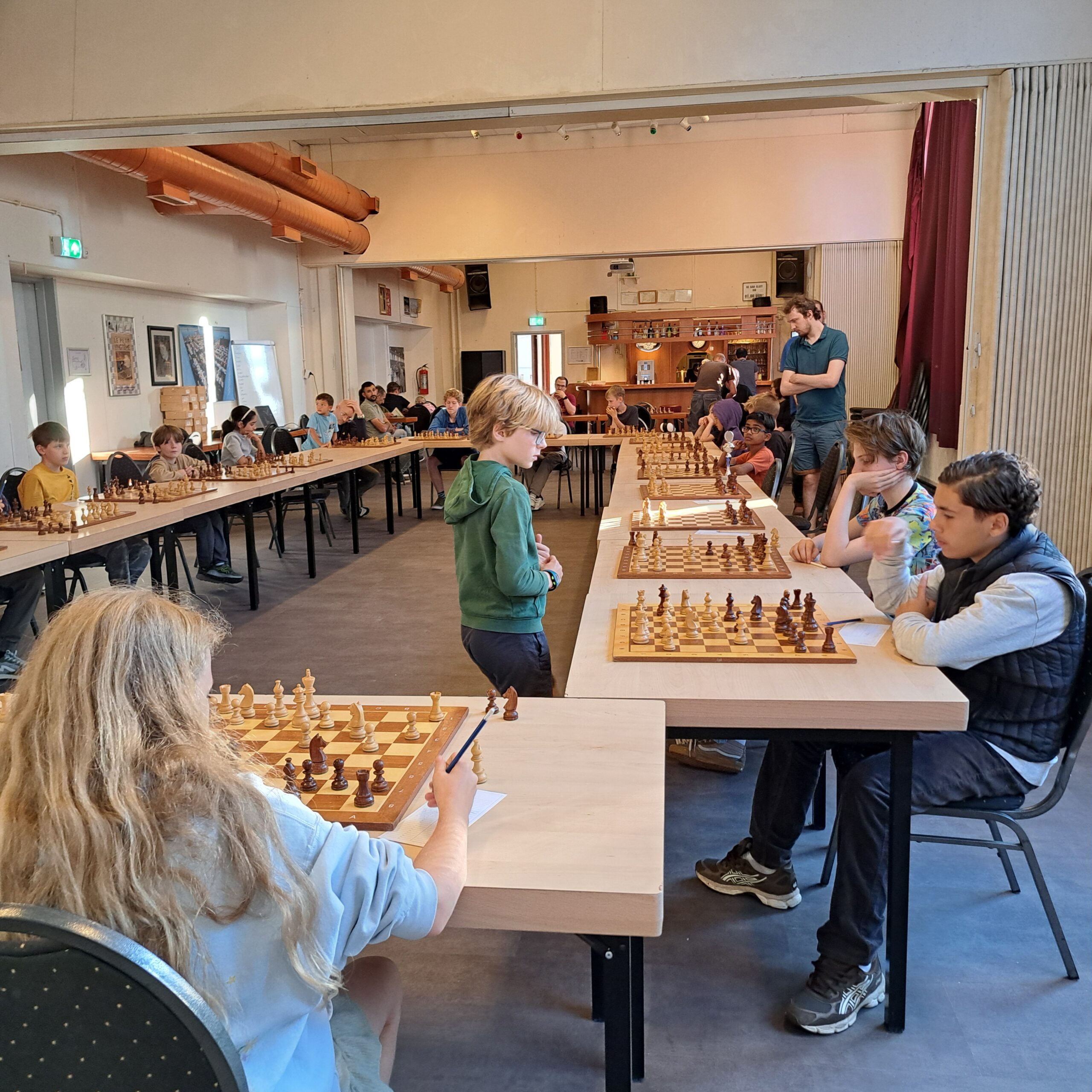 Onverstoorbaar werd doorgespeeld, ook al kwamen inmiddels de senioren een deel van de ruimte innemen met hun klassieke partijen. Douwe wist niet van wijken. Maar ook zijn tegenspelers weken niet! Dat pakte bijvoorbeeld voor Evi goed uit. In een enkele partij had Douwe eerder op kunnen geven en in een aantal andere partijen hadden tegenstanders eerder op kunnen geven. Maar er werd verbeten doorgespeeld. Het resultaat was er naar. Van de 17 tegenstanders wisten Duncan, Evi en Morris te winnen. De partij tegen Evi was een van de laatste die nog bezig was. Jacob, Saaibhaskar en Uri hielden Douwe op remise. Al met behaalde Douwe een prima resultaat van 74%.