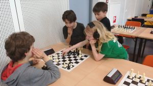 belangrijk kampioenschap. Het ging om de E team Kampioenschappen voor Clubs. Voor dit eendaagse toernooi in Leusden stelden we een team samen van kinderen tot en met 9 jaar. Op bord 1 moest Duncan Elferink spelen. Gewend aan genoeg toernooien was voor het eerst op bord 1 spelen best een uitdaging. Hij wist van tevoren al wel dat hij zeer sterke tegenstanders zou gaan tegenkomen van soms bijna dubbel zijn rating. Maar gelukkig weerhield hem dat er niet van om er vol voor te gaan met het motto ‘opgeven is alleen voor grootmeesters’ in gedachten. Op bord 2 speelde Jonah Bijwaard. Jonah heeft in de externe competitie al heel wat ervaring opgedaan en speelde rustig en bedaard redelijk lange partijen. Een van de partijen was zelfs d